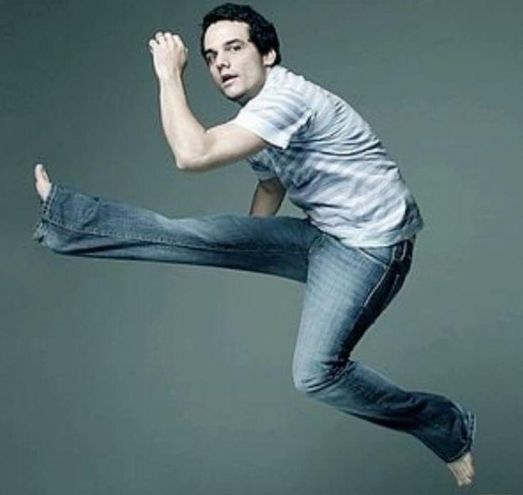 A photo of actor Wagner Moura jumping or "flying" in the air, wearing a striped shirt and jeans.